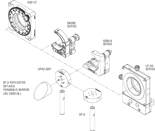 UPA2-OAP is a versatile adaptor used to provide a mounting interface for Replicated Off-Axis Parabolic Mirrors. It allows mounting in three ways: vertical post mounting, horizontal post mounting, and can be mounted into any positioner that can hold a 2 in. diameter optic, such as mirror mounts, lens mounts, and rotation mounts.