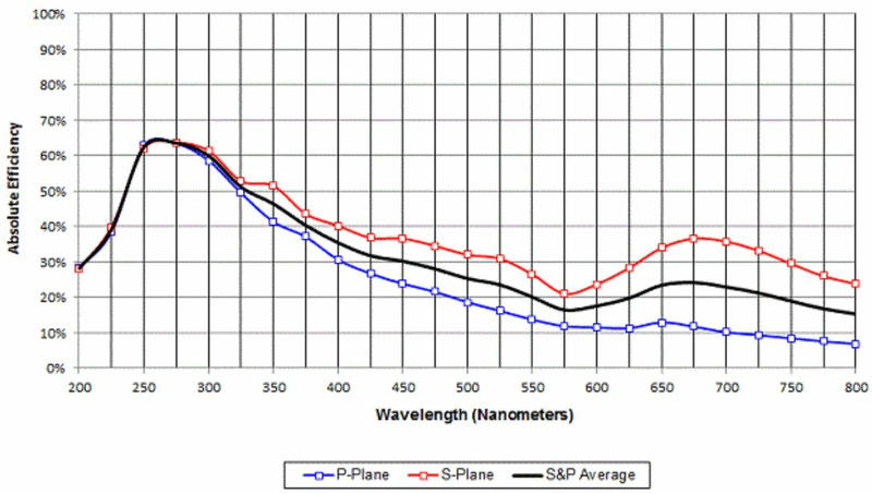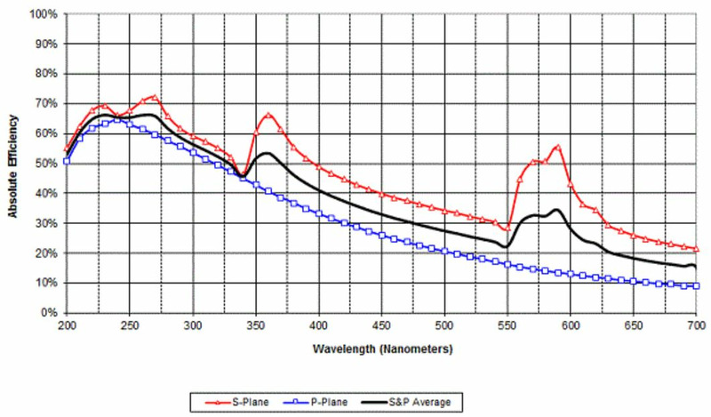 Holographic diffraction gratings can have very high diffraction efficiency, even above that of flat aluminum reflectors, at the design wavelengths and orientation. Diffraction efficiency is highly dependent on the polarization state. Planar holographic gratings typically feature narrower spectral bandwidth, and have their peak efficiency at a shorter wavelength for P-polarization compared to S-polarization. For laser cavity applications this property may be used to feed light from a specifically chosen wavelength and polarization state back into the laser gain medium to control the output of the laser. Conversely, applications such as spectrometers designed to operate using unpolarized light may require the use of two gratings in conjunction with a polarizing beamsplitter to obtain optimum results.