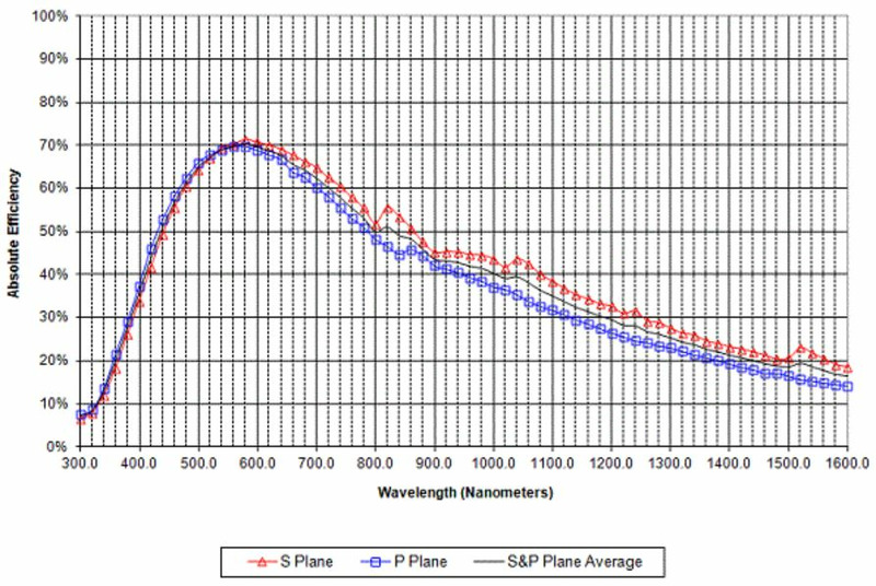 In general, for ruled diffraction gratings the groove spacing determines the diffraction angles, and the groove depth and blaze angle determines how diffracted energy is distributed between diffraction orders. Designed for first order Littrow use, Newport’s Plane Ruled Reflection Gratings are blazed to achieve extremely high single-order diffraction efficiency at particular design wavelengths. At Newport, we have three ruling engines in full-time operation, each producing high-quality master gratings each year. These ruling engines provide gratings with triangular groove profiles, very low Rowland ghosts, and high resolving power. Mechanically ruled, individual grooves are burnished with a diamond tool against a thin coating of evaporated metal. Utilizing a high fidelity cast replication process, developed and enhanced through years of research and manufacturing experience, we have the ability to provide duplicates of master gratings that equal the quality and performance of the master grating.