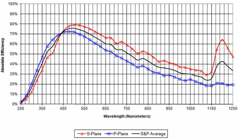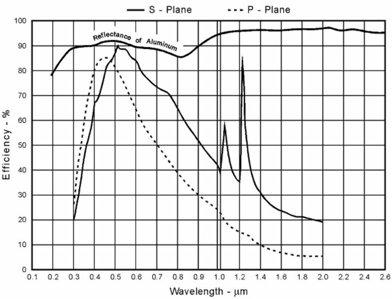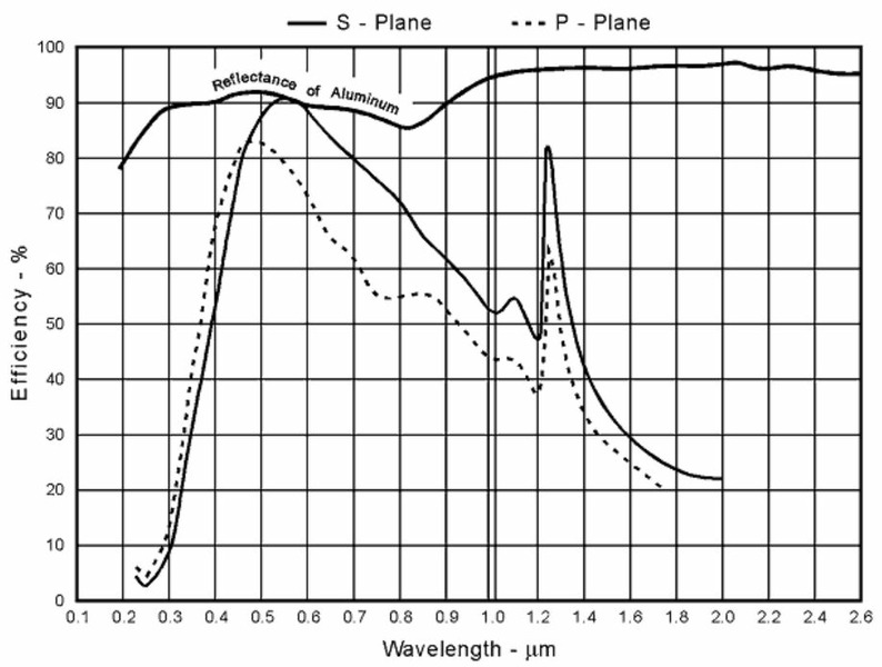 In general, for ruled diffraction gratings the groove spacing determines the diffraction angles, and the groove depth and blaze angle determines how diffracted energy is distributed between diffraction orders. Designed for first order Littrow use, Newport’s Plane Ruled Reflection Gratings are blazed to achieve extremely high single-order diffraction efficiency at particular design wavelengths. At Newport, we have three ruling engines in full-time operation, each producing high-quality master gratings each year. These ruling engines provide gratings with triangular groove profiles, very low Rowland ghosts, and high resolving power. Mechanically ruled, individual grooves are burnished with a diamond tool against a thin coating of evaporated metal. Utilizing a high fidelity cast replication process, developed and enhanced through years of research and manufacturing experience, we have the ability to provide duplicates of master gratings that equal the quality and performance of the master grating.