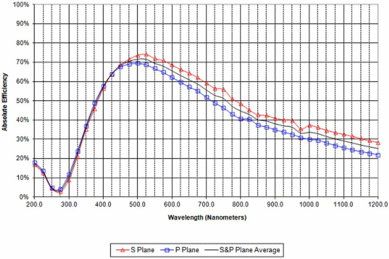 In general, for ruled diffraction gratings the groove spacing determines the diffraction angles, and the groove depth and blaze angle determines how diffracted energy is distributed between diffraction orders. Designed for first order Littrow use, Newport’s Plane Ruled Reflection Gratings are blazed to achieve extremely high single-order diffraction efficiency at particular design wavelengths. At Newport, we have three ruling engines in full-time operation, each producing high-quality master gratings each year. These ruling engines provide gratings with triangular groove profiles, very low Rowland ghosts, and high resolving power. Mechanically ruled, individual grooves are burnished with a diamond tool against a thin coating of evaporated metal. Utilizing a high fidelity cast replication process, developed and enhanced through years of research and manufacturing experience, we have the ability to provide duplicates of master gratings that equal the quality and performance of the master grating.