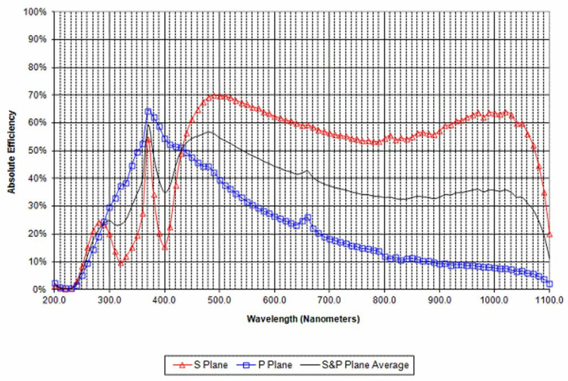 Holographic diffraction gratings can have very high diffraction efficiency, even above that of flat aluminum reflectors, at the design wavelengths and orientation. Diffraction efficiency is highly dependent on the polarization state. Planar holographic gratings typically feature narrower spectral bandwidth, and have their peak efficiency at a shorter wavelength for P-polarization compared to S-polarization. For laser cavity applications this property may be used to feed light from a specifically chosen wavelength and polarization state back into the laser gain medium to control the output of the laser. Conversely, applications such as spectrometers designed to operate using unpolarized light may require the use of two gratings in conjunction with a polarizing beamsplitter to obtain optimum results.