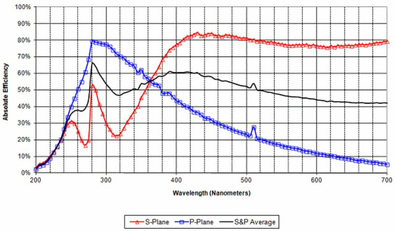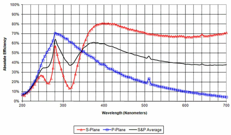Holographic diffraction gratings can have very high diffraction efficiency, even above that of flat aluminum reflectors, at the design wavelengths and orientation. Diffraction efficiency is highly dependent on the polarization state. Planar holographic gratings typically feature narrower spectral bandwidth, and have their peak efficiency at a shorter wavelength for P-polarization compared to S-polarization. For laser cavity applications this property may be used to feed light from a specifically chosen wavelength and polarization state back into the laser gain medium to control the output of the laser. Conversely, applications such as spectrometers designed to operate using unpolarized light may require the use of two gratings in conjunction with a polarizing beamsplitter to obtain optimum results.