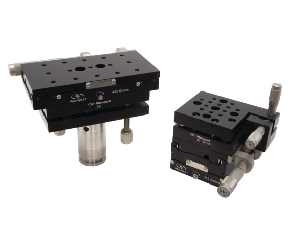 423 series stages are compatible with our multi-axis tilt platforms to provide full alignment capability. On the left, the 443 linear stage is mounted atop the Model 39 which provides tip/tilt adjustment. On the right, Model 36 is mount to an xy stack of 423 linear stages.