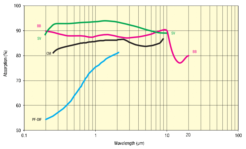 The thermopile detector’s response to the input laser beam is characterized by its absorption. Newport thermopile sensors use four different types of coating in the sensors. The broadband BB type is employed in most of the 919P models and has an excellent absorption throughout the responsive wavelength range. The CM and SV types are used mainly with high repetition lasers with ultra-short pulses and have a relatively flat response.
