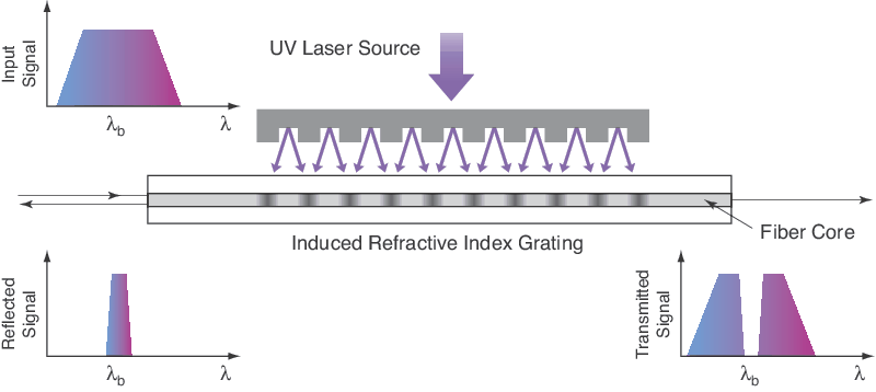 Photosensitive optical fibers provide significant advantages for high volume FBG production lines by dramatically reducing the production time per FBG..A Bragg Grating is a periodic modulation in the fiber’s index of refraction reflecting light with a wavelength of twice the grating period. The grating forms when the fiber is exposed to a periodic pattern of UV light, typically generated with a phase mask. Fiber lasers and DWDM add/drop filters utilize the ability of Bragg Gratings to reflect <99% of the light in a narrow wavelength band (~1 nm). Other uses of fiber gratings include laser diode frequency stabilization and fiber sensors that detect chemicals, mechanical strain, vibration, acceleration or temperature. Gratings may also be chirped to provide dispersion compensation or gain flattening.