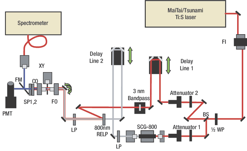 In this solution a Phonic crystal fiber is used to generate broadband Supercontinuum that can be used as a Stokes pulse. Shown is a block diagram of the experimental setup with the following components: FI – Faraday isolator, 1/2 WP – half wave plate, BS – beam splitter, RELP – razor edge long pass filter, LP – long pass filter, SCG-800 – supercontinuum generation kit, FO – focusing objective, CO – collimating objective, SP – combination of short pass filters, FM – flip mount, PMT – photomultiplier. Our CARS Microspectrometer application note provides detailed information on set up, alignment and components used in this experiment.
