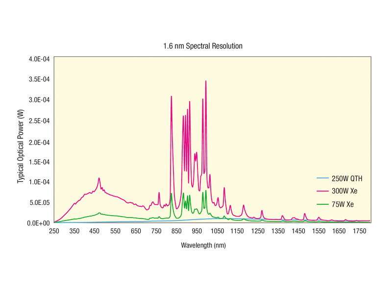 The resolution is the ability to separate wavelengths. It is usually expressed as the Full Width Half Maximum (FWHM). The resolution can be theoretically determined by multiplying the reciprocal dispersion of the grating by the slit width. The monochromator bandpass with a 1200 lines/mm grating is half that of the same arrangement with a 600 lines/mm grating. Note that this simple relationship is not accurate for slit widths below 50 µm, as the optical aberrations begin to play a role in the resolution.