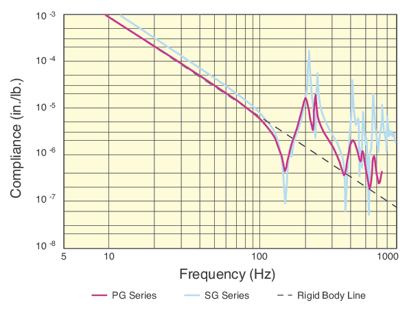 The 4.8 mm thick working surface on SG optical breadboards is bonded to a polymeric material that serves to seal the honeycomb core and damp the working surface. The trussed honeycomb is vertically bonded enabling a rigid triple core interface. Although the adhesive is rigid, its broadband damping factor is much higher than that of steel and introduces substantial damping into the core. The side panels are made of a highly damped, epoxy sealed wood composite. Compared to the metal sides used by other breadboard manufacturers, the composite wood sides offer significant damping to the structure and eliminate another source of resonance. The damping performance is evaluated and represented by a compliance curve. For better damping performance, check out our precision grade optical breadboards with patented modal damping.