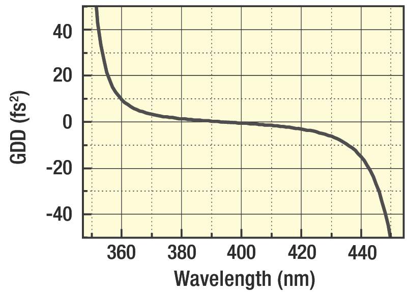 UF.HR40 provides reflectance higher than 99.6% and low GDD in a wavelength range of approximately 80 nm centered at 400 nm. This is the maximum bandwidth achievable in this wavelength range with absorption-free non-dispersive dielectric mirrors and supports minimum pulse durations ranging from 9 fs to 12 fs, depending on the spectral shape.