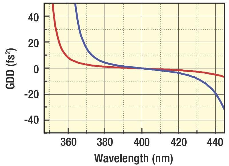 UF.HR45 provides reflectance higher than 99.5% and low GDD in a wavelength range of approximately 60 nm centered at 400 nm, for an angle of incidence of 45° and p-polarized light. For s-polarized light, the bandwidth increases to 90 nm at 400 nm. This is the maximum bandwidth achievable in this wavelength range with absorption-free non-dispersive dielectric mirrors. Blue: S-Polarized Light, Red: P- Polarized Light.