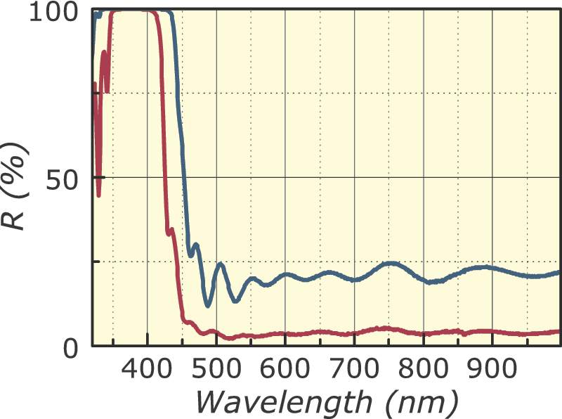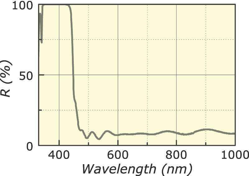 The UF.HR45 coating is very versatile. Not only is it a high reflector for 400 nm, the mirror doubles as a dichroic filter, transmitting 800 nm.