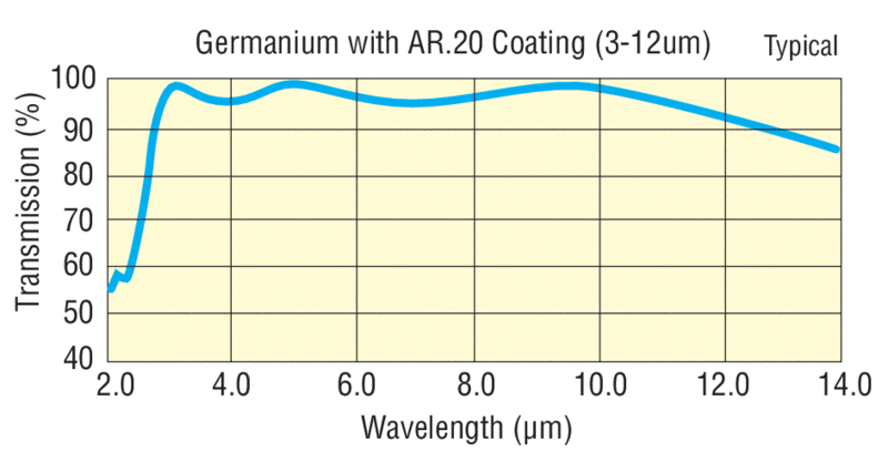 Germanium windows are ideal for IR applications at a broad range of wavelengths, including use in lower power CO2 lasers. Germanium also has low dispersion, ideal for imaging applications. The windows feature an AR coating providing high transmission from 3 to 12 µm.