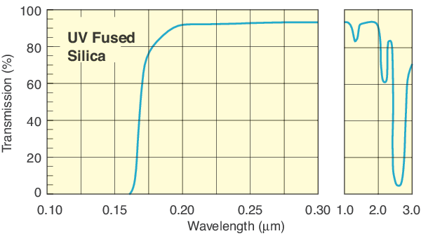 UV Grade Fused Silica is synthetic amorphous silicon dioxide of extremely high purity providing maximum transmission from 195 to 2100 nm. This non-crystalline, colorless silica glass combines a very low thermal expansion coefficient with good optical qualities and excellent transmittance in the ultraviolet region. Transmission and homogeneity exceed those of crystalline quartz without the problems of orientation and temperature instability inherent in the crystalline form. It will not fluoresce under UV light and is resistant to radiation. For high-energy applications, the extreme purity of fused silica eliminates microscopic defect sites that could lead to laser damage.