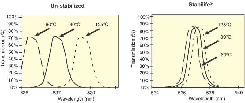 Stabilife coatings are typically 5 to 10 times less sensitive to thermal variation than un-stabilized metal oxide films as a result of film densification. Temperature change functions are a catalyst for moisture migration in thin films having a significant volume of voids. When un-stabilized films are exposed to high temperatures, moisture migrates out of film voids contributing to the wavelength change discussed earlier. The high film density and reduced permeability resulting from the Stabilife processes reduces this effect providing the maximum spectral stability available for all types of precision coatings including bandpass, dichroic, edge, notch and polarizer coatings.