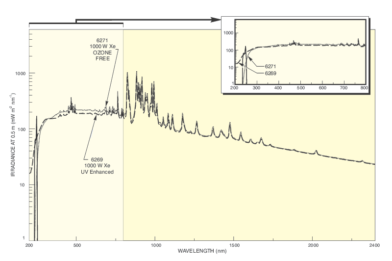 450 W Xenon lamps are offered in UV Enhanced or Ozone Free versions. Xe lamps have a white light output very similar to the sun and a high color temperature, making these lamps useful for solar simulation. These lamps are also popular for wafer inspection. 6279NS Ozone free lamp is excellent option when wavelength emission below 260 nm are not required. If an ozone creating lamp must be used, it is recommended to use the light source near a ventilation port or outdoors. For users requiring the output of a Xe arc lamp with additional intensity in the UV region, 6278 UV Enhanced Xe arc lamp is offered.