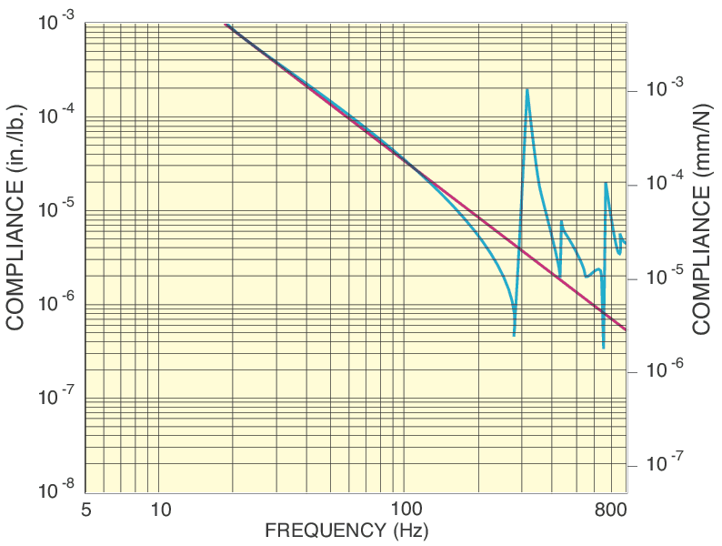 The compliance curve shows the positional motion of the breadboard structure for a given excitation force and frequency. The red is the rigid body line showing how an ideal optical breadboard would perform with no relative motion. The blue line shows the natural frequencies of an IG breadboard and how they deviate from that of a rigid body.