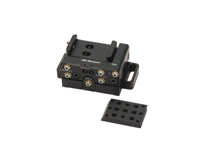 The 9031 Six-Axis Device Alignment Stage is ideally suited for intuitive alignment of electro-optic, acousto-optic modulators or lenses. The stage features a removable, 4-40 (M3) threaded top plate to simplify mounting and replacement of optical devices. A top plate is included with the mount but they are also sold individually. Two keying pin holes in the base assist in setting the exact mounting location of the stage in industrial applications. The mounting slots on the 9031 for 8-32 (M4) cap screws are compatible with industry standard mounting hole spacing. This means they can be mounted on to our standard tables and breadboards with nothing more than our 8-32 to ¼-20 (M4 to M6) TR-series thread adapters and screws.