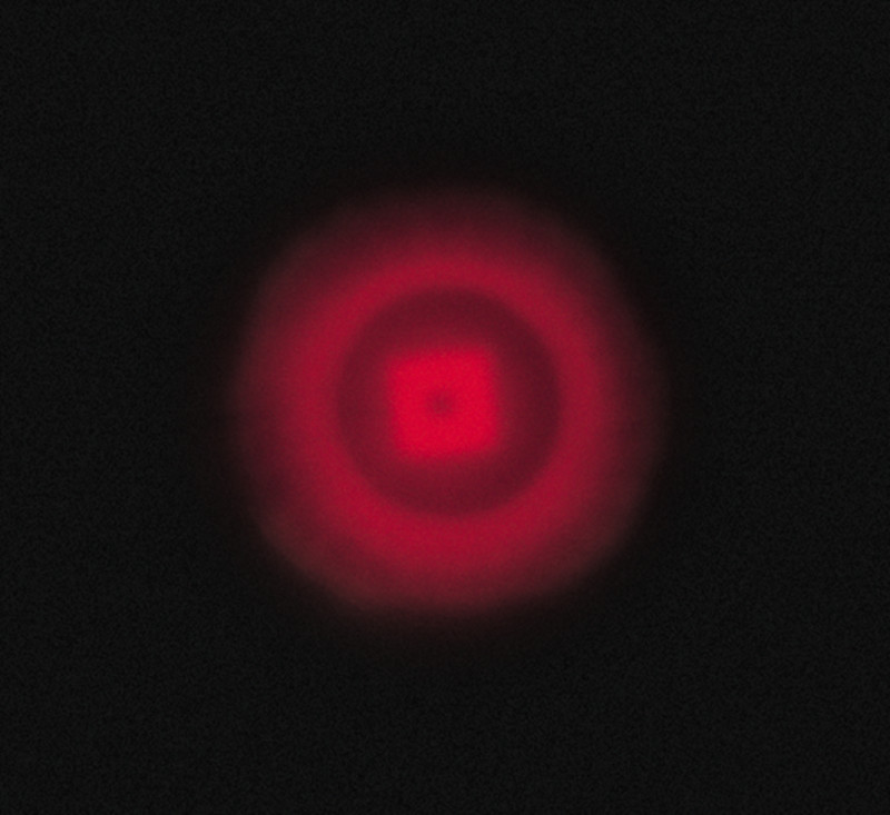 Light Shaping Diffusers also precisely shape, control, and distribute light into a specific cone angle. This cone angle can be either symmetrical (circular) or asymmetrical (elliptical). Standard circular angles range from 0.5° to 80° FWHM, while standard elliptical angles range from 0.2° x 10° to 35° x 95°. Transmission efficiency is superior to other diffusers between 365–1600 nm. The diffuser surface is antireflective in nature and therefore utilizes light that would otherwise be wasted due to Fresnel loss. LED light is shown before and after a circular and elliptical diffuser.