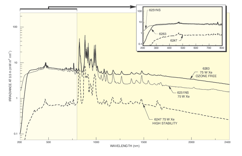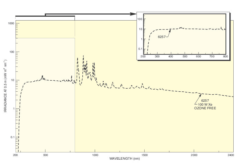 The 6254 150 W UV Enhanced Xe lamp is a useful option for those who need the visible to NIR performance of a Xe lamp without the drop in UV light output typical of a Xe arc lamp.