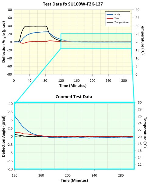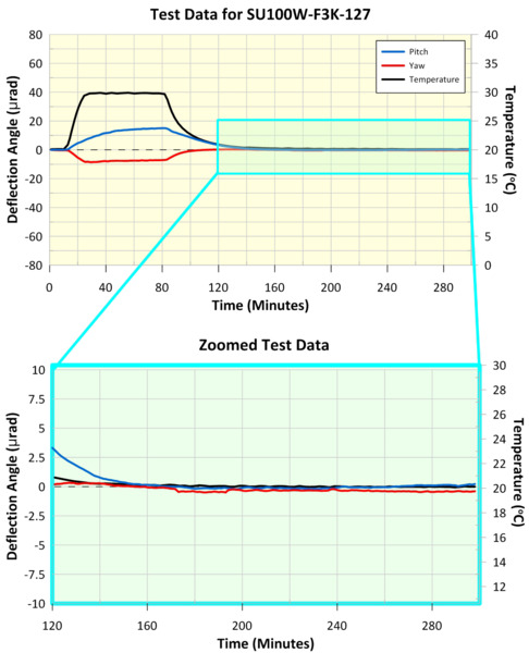 The maximum deflection of the SU100W-F3K-127 mirror mount during peak temperature was 15 µrad in pitch and 10 µrad in yaw, and the shift in reflected beam position after temperature cycling was < 1 µrad in pitch and < 1 µrad in yaw. This demonstrates the mount's excellent thermal properties. Further details are shown in the accompanying graphs.