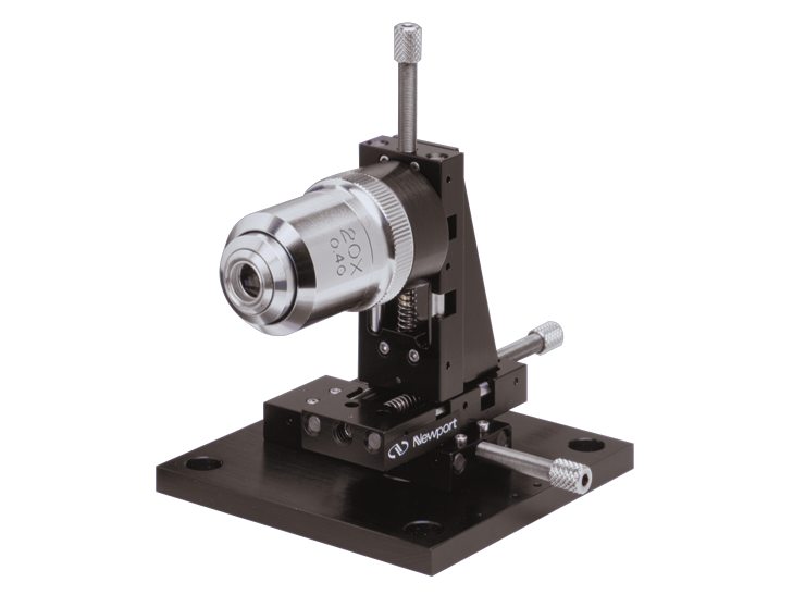The objective adapter MS-OA-3 allows mounting of standard microscope objectives to MS-500 stages. A Newport M Series Objective Lens is shown with Model MS-500-XYZ stage to create a miniature XYZ objective lens positioner.