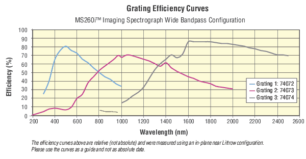 - Three low line density ruled gratings used for high optical performance from 300-2400 nm
