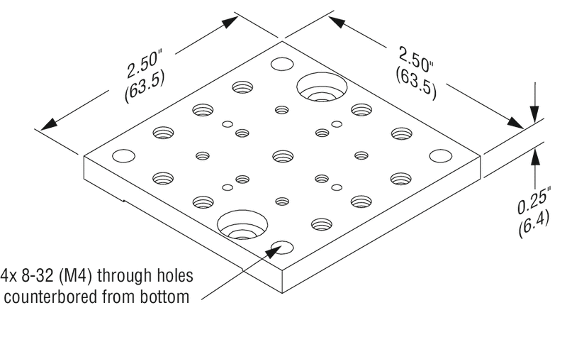The 9028 and 9028-M Modular Spacer Plates can be placed below or above our translation stages to add height in 1/4 in. (6.4 mm) increments and measure 2.5 in. ( 63.5 mm) on each side. Attaching them to the tops of the stages provides additional 8-32 and 1/4-20 (9028) or M4 and M6 (9028-M) mounting holes.