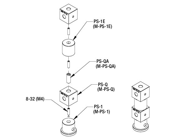 PS-Q Optical Pedestal Cubes are designed for mounting 1.0 in. PS Series Optical Pedestals and Posts at a 90° angles to one another. This provides the high stability mounting offered by the 1 in. (25.4 mm) diameter posts in multiple dimensions without the need of additional mounting space of bulky stages and additional clamping forks. These solid stainless steel cubes are offered with 8-32 or M4 threaded holes for mounting, as well as larger clearance holes.
