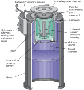The S-2000's superior horizontal isolation is achieved through a mechanical filter system. Compared with other manufacturers' contacting bearing surfaces, Newport introduces zero friction trifilar pendulum system emerged in energy dissipating oil to eliminate the friction that commonly disturb high accuracy applications, thus enabling isolation to much lower vibration levels as well as high accuracy table repositioning after disturbances. In addition, the S-2000 design features proprietary self centering capability, to better ensure isolator alignment and eliminate horizontal shorting which could happen in other designs.