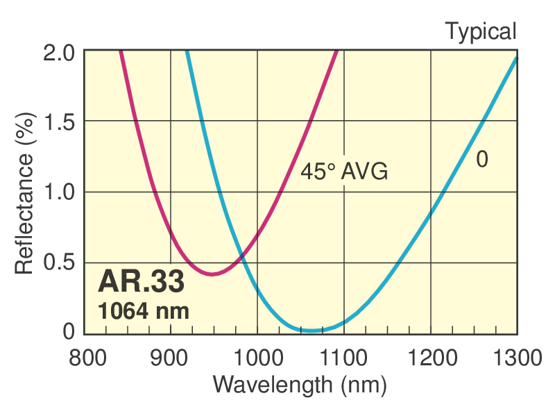 Our AR.33 laser line V-coating offers the lowest reflectance (maximum reflectivity per surface <0.25%, 0º-15º AOI) at 1064 nm for maximum transmission while maintaining high durability and high damage resistance. Valuable laser energy is efficiently transmitted rather than lost to surface reflection and scattering. The trade off to its superior performance is the minimal laser line wavelength range.