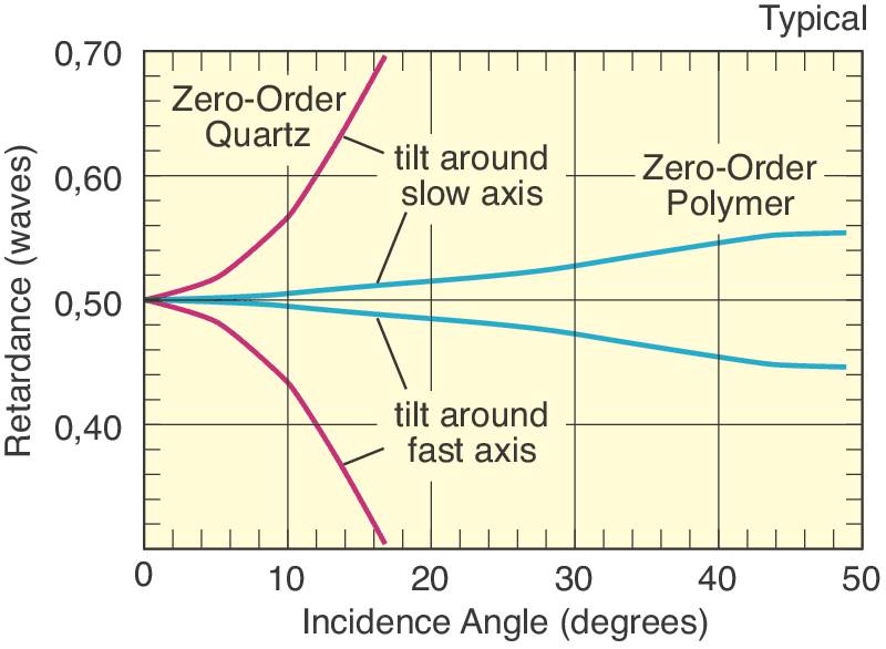 Retardation in zero-order wave plates is insensitive to temperature since thermal changes between the two quartz plates tend to cancel out. A typical zero-order wave plate has a temperature coefficient of 0.0001 λ/°C compared to 0.0015 λ/°C for a multiple-order wave plate, providing less change in retardation over an extended temperature range.