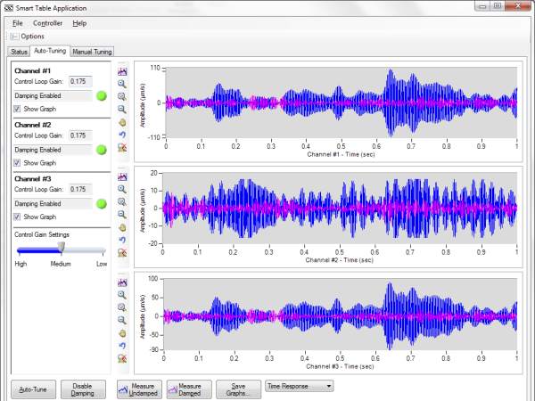 SmartTable active damping products are easy to set up and operate. Simply connect the IQ dampers with controller and press "Auto-Tune" button on the controller, the system will automatically find the resonances of the table and set gain parameters. Once the tuning is finished, the dampers will start working to damp vibrations on your tabletop real time. This feature also enables users to improve their table performance under different payload or payload distributions - press "Auto-Tune" when you have a major change in your set up to achieve the maximized damping performance.