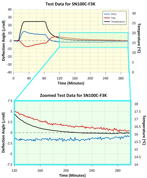 The maximum deflection of the SN100C-F3K mirror mount during peak temperature was 13 µrad in pitch and 8 µrad in yaw, and the shift in reflected beam position after temperature cycling was < 1 µrad in pitch and < 1 µrad in yaw. This demonstrates the mount's excellent thermal properties. Further details are shown in the accompanying graphs.