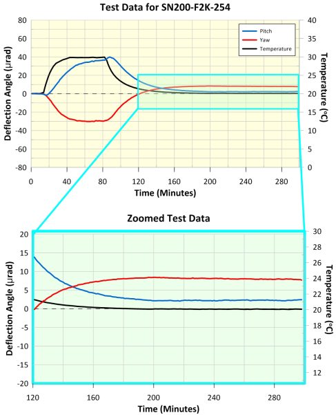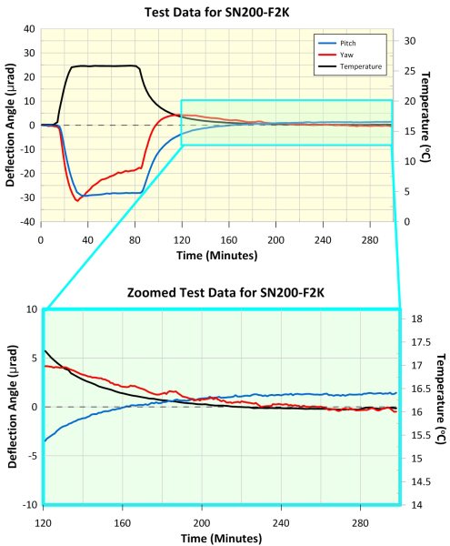 The maximum deflection of the SN200-F2K mirror mount during peak temperature was 30 µrad in pitch and 32 µrad in yaw, and the shift in reflected beam position after temperature cycling was < 2 µrad in pitch and < 1 µrad in yaw. This demonstrates the mount's excellent thermal properties. Further details are shown in the accompanying graphs.