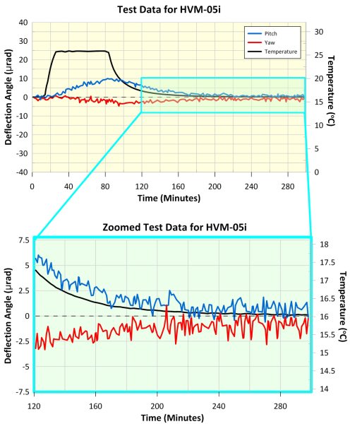 The maximum deflection of the HVM-05i mirror mount during peak temperature was 10 µrad in pitch and 5 µrad in yaw, and the shift in reflected beam position after temperature cycling was < 2 µrad in pitch and < 2 µrad in yaw. This demonstrates the mount's excellent thermal properties. Further details are shown in the accompanying graphs.