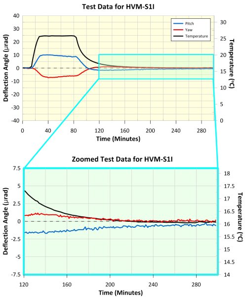 The maximum deflection of the HVM-S1i mirror mount during peak temperature was 10 µrad in pitch and 7 µrad in yaw, and the shift in reflected beam position after temperature cycling was < 1 µrad in pitch and < 1 µrad in yaw. This demonstrates the mount's excellent thermal properties. Further details are shown in the accompanying graphs.