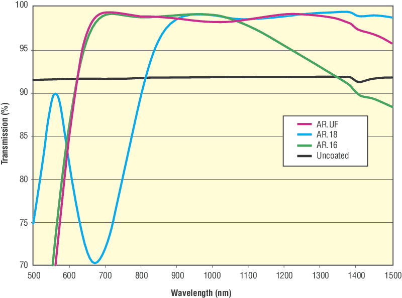 Our broadband ultrafast optimized antireflection coating is optimized specifically for 660-1380 nm ultrafast laser wavelengths to provide low GVD performance. Typical transmission performance of the AR.UF coating is shown compared to an uncoated lens and our standard AR.16 and AR.18 coatings covering similar wavelengths.