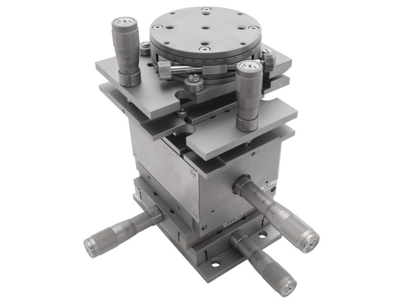 The UTR Steel Rotation Stages are compatible with UMR Steel Linear Stages, TGN Series Tilt Platforms, and MVN Precision Vertical Stages of matching size (for example, UTR80 with UMR8.25 and TGN80 , or UTR120 with TGN120 and MVN120). They can be combined to provide multi-axis motion and can be easily adapted to fit a specific system's needs. In the picture, a six-axis manual positioning system is shown using two UMR8.25s, two TGN80s, a UTR80S, and a MVN80. (Hint: first assemble Y & Z stages from the backside of Y stage, and then connect X stage to YZ from backside of X. In both steps, the carriage of UMR stage needs to be translated to each end of the travel range to reveal access holes, please refer to UMR stage XY assembly video.)