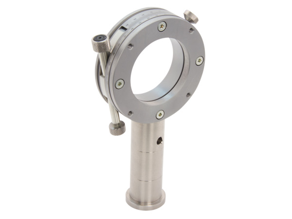 Disengaging the side-mounted clutch knob permits continuous 360° free rotation. Once the approximate angular orientation is obtained, a zero-backlash manual drive provides a fine adjustment of 4°, which can be locked down by the lock knob opposing the fine adjustment knob once the final alignment is achieved. Scale markings and a vernier on the side of the rotation stage measure angular position with 1 arc min resolution. Sensitivities range from 2 to 6 arc second depending on the model.
