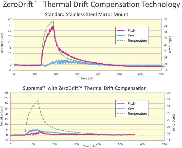 Because the thermal deflection of optical mounts can be characterized, and these deflections can be controlled through thermal expansion compensation, the thermal deflection of an optical mount can be nearly eliminated. This patent-pending innovation is called ZeroDrift™ Technology.