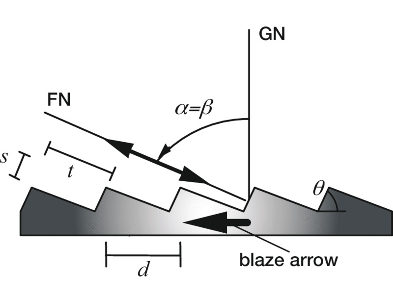 Diffraction Grating Physics Guidelines for Specifying Diffraction Gratings Handling Diffraction Gratings The Grating Equation Grating Prisms (GRISMS) The Blaze Arrow Determination of the Blaze Wavelength Differences Between Ruled and Holographic Gratings Blazing of Holographic Reflection Gratings Blazing of Ruled Transmission Gratings