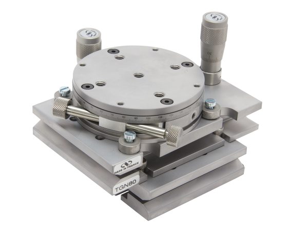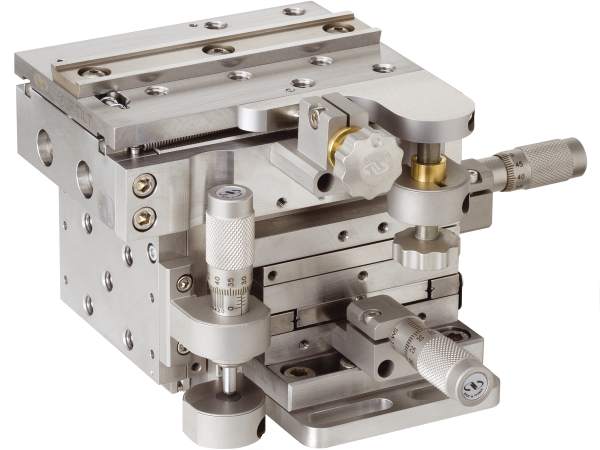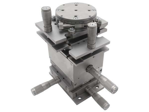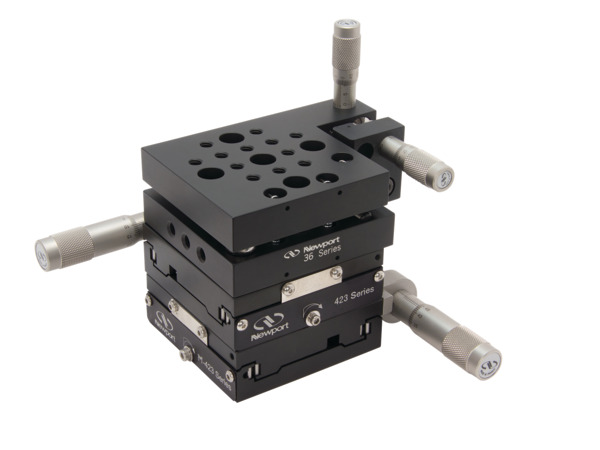 Many of Newport's Manual Linear, Vertical, Rotation and Goniometric Positioners and Tilt Platforms have been designed to operate together so that they can easily be combined into countless cohesive multi-axis positioner assemblies. By matching types of materials and motion characteristics among the types of positioners, and by designing the stages to connect to each other in the most convenient and efficient ways, individual stage performance in one axis is maintained in a multi-axis assembly. Moreover, the footprint and envelope of a multi-axis system is minimized while load capacity is maximized. Below are examples of high-performance multi-axis positioning systems that can be assembled with complementary Newport manual positioners.