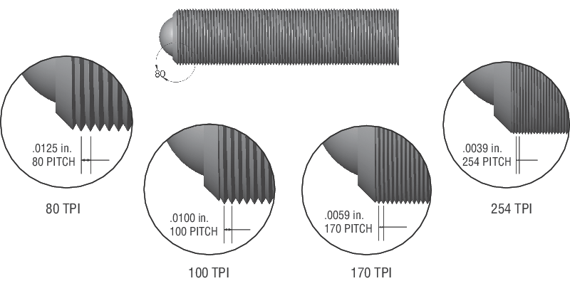 The reciprocal of TPI (also called thread pitch) is the axial length of just one thread. Thread pitch also represents how far the adjustment screw will travel with one full rotation of the adjustment knob. For calculating adjustment sensitivity we say that the smallest rotation a person can make on an adjustment knob is 1 degree. Calculating the adjuster's minimum incremental movement is simply the reciprocal of TPI divided by 360.