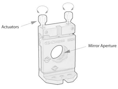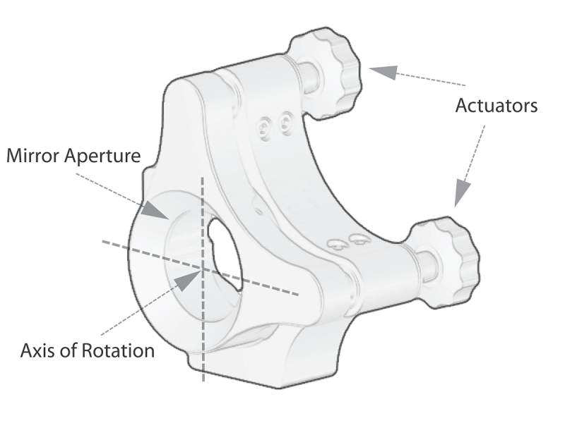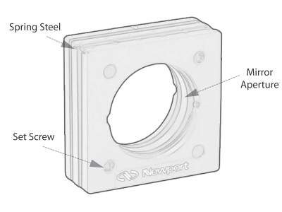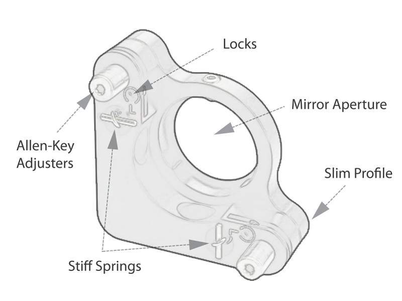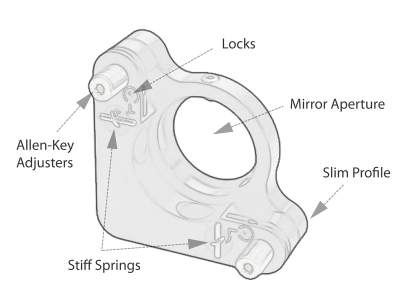 Corner Mounts hold the mirror in a unique corner location to provide both a clearer beam path and enable gimbal movement. To achieve gimbal movement, two adjacent adjustment screws must be actuated the exact same distance