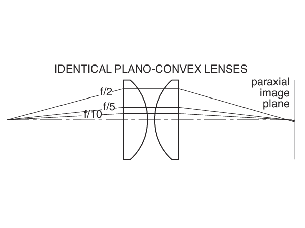 Choosing the right lens shape is critical in order to minimize the optical aberrations. Multiple lenses can be used where one singlet can cancel the aberration caused by another. Generally, when working at or near infinite conjugate (collimated light on one end of the lens), a plano-convex/concave lens or achromatic doublet lens will work best. When working at finite conjugates close to 1:1 ratio, a bi-convex/concave lens would be more ideal. Sometimes using two lenses at infinite conjugate back to back provides even better performance at conjugates near 1:1.