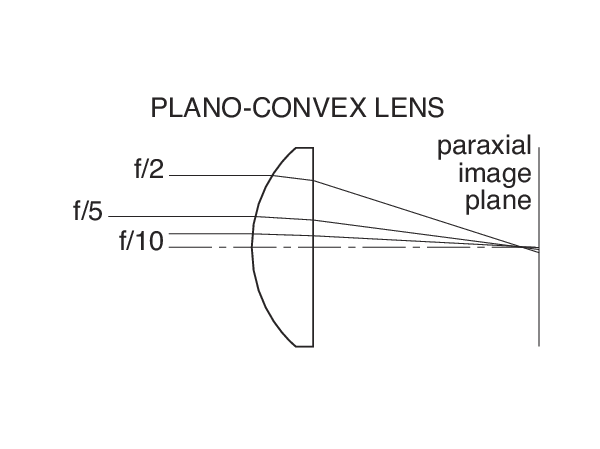Plano-Convex Lenses are the best choice for focusing parallel rays of light to a single point, or a single line in the case of cylindrical lenses. This lens can be used to focus, collect and collimate light. It is the most economical choice for demanding applications. The asymmetry of these lenses minimizes spherical aberration in situations where the object and image are located at unequal distance from the lens. The optimum case is where the object is placed at infinity (parallel rays entering lens) and the final image is a focused point. Although infinite conjugate ratio (object distance/image distance) is optimum, plano-convex lenses will still minimize spherical aberration up to approximately 5:1 conjugate ratio. For the best performance, the curved surface should face the largest object distance or the infinite conjugate to reduce spherical aberration.