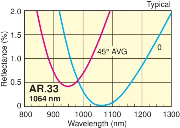 V-coatings offer the lowest reflectance for maximum transmission. With its high durability and high damage resistance, Laser line AR V-coating can be used at almost any UV-NIR wavelength with average reflectance less than 0.25% at each surface for a single wavelength. Valuable laser energy is efficiently transmitted through complex optical systems rather than loss to surface reflection and scattering. The trade off to its superior performance is the reduction in wavelength range. AR.33 for 1064 nm is available from stock on most Newport lenses. All other V-coating can be coated on a semi-custom basis.