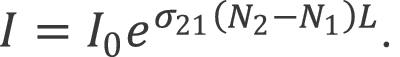 Gain in a laser medium can be described by considering two energy levels with population densities, N2 and N1 and an associated transition cross section σ21, as described by the below equation. Since population exists in both levels, absorption and stimulated emission will occur within the medium. If I0 is the intensity of a beam (See Characteristics of Laser Output) before entering a material that has a length L, the light intensity I exiting the material is given by: