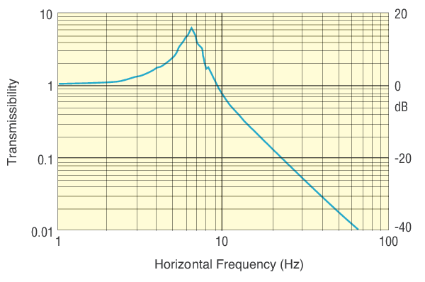 In the horizontal direction, VIBe technology utilizes steel ball bearings sandwiched between precision raceways to form a plane of isolation. When under load, the bearings will deflect horizontally if a horizontal force is applied above or below the plane of isolation. Micro-vibrations cause the balls to displace between the two raceways and cut off the transmission of vibrations. The balls that displace are restored to the neutral position by gravity, which acts as a non-linear spring. Since the spring force (i.e., the restoring force) is non-linear, it is constant and independent of the frequency and amplitude of the input vibrations, meaning the balls' oscillating motion has no "natural" frequency. Instead, the oscillating motion has an infinite number of frequencies, one for each increment of displacement, making the resonance between the two halves of the plane of isolation physically impossible. As a result, the horizontal spring filter filters out (whites out) a broad band of input vibration frequencies and ensures a constant level of vibration transmission reduction.